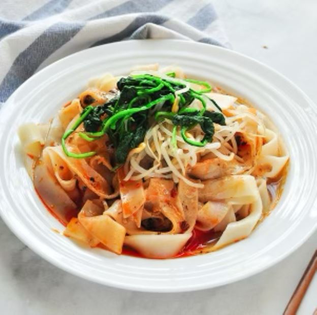 Ingredients: Wheat flour, Spinach, Soy bean sprout, Homemade Chilli oil, Garlic sauce, Vinegar, Sesame paste.(sauce aside)