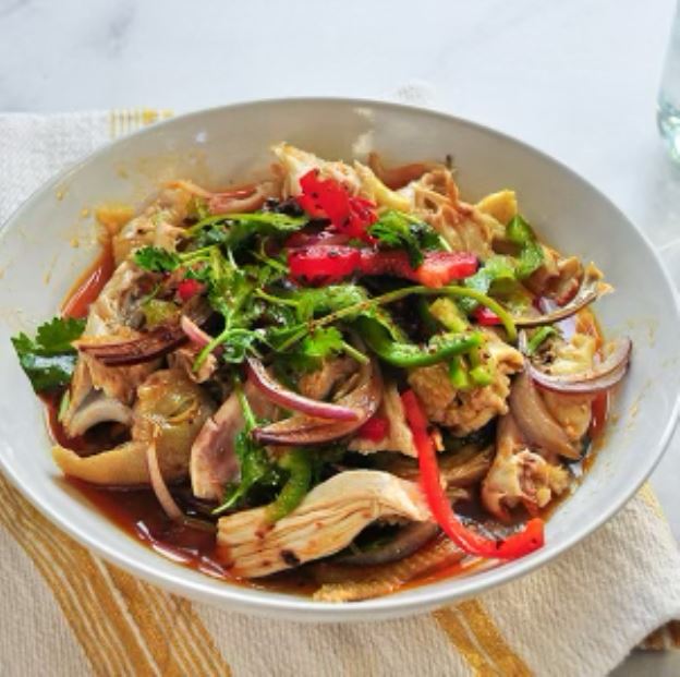 Ingredients: Brown Chicken, Cilantro, Red bell pepper, Green bell pepper, Chili oil, Homemade Chicken soup base with Sichuan peppercorns and rattan pepper.