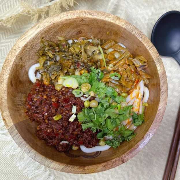 Ingredient:Thick Rice Noodle,Homemade Beef chili sauce, sauerkraut, sour cowpea, green onion, crispy soy bean.