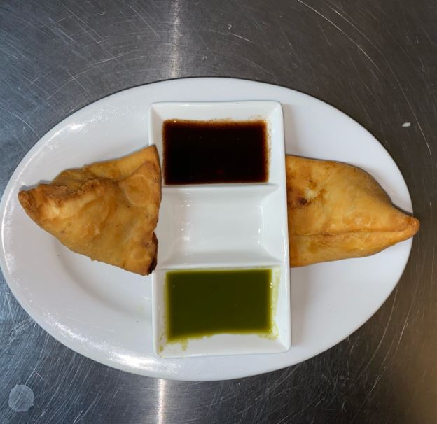 Triangular turnovers filled with potatoes and green peas,Indian Spices.served with mix of mint and tamarind chutney.