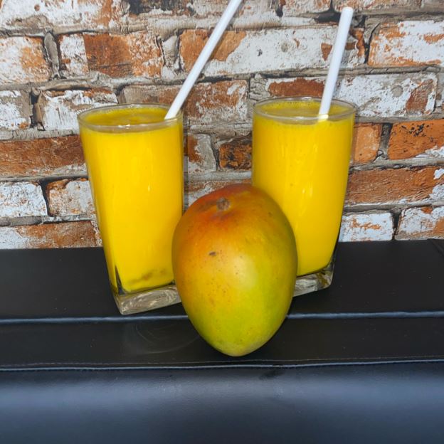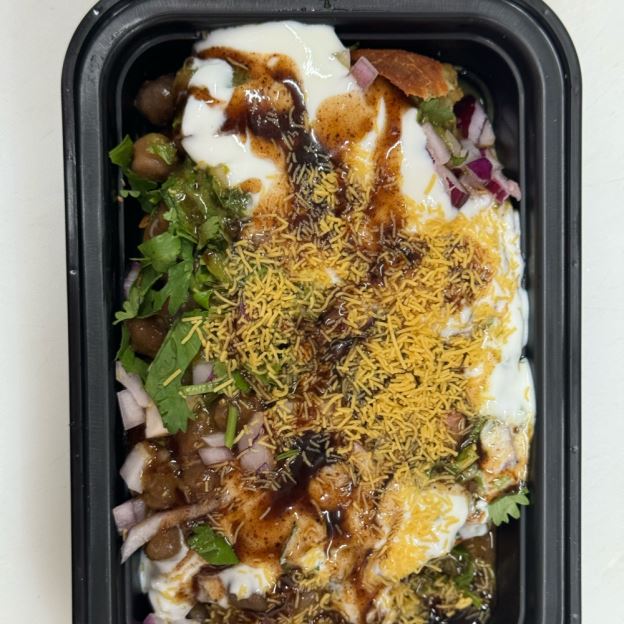 Potato and Kale Stuffed with seasoned gram topped with mint, mango kiwi and tamarind chutney