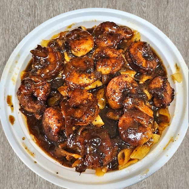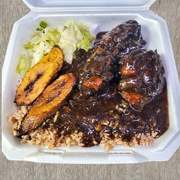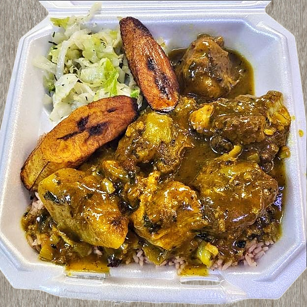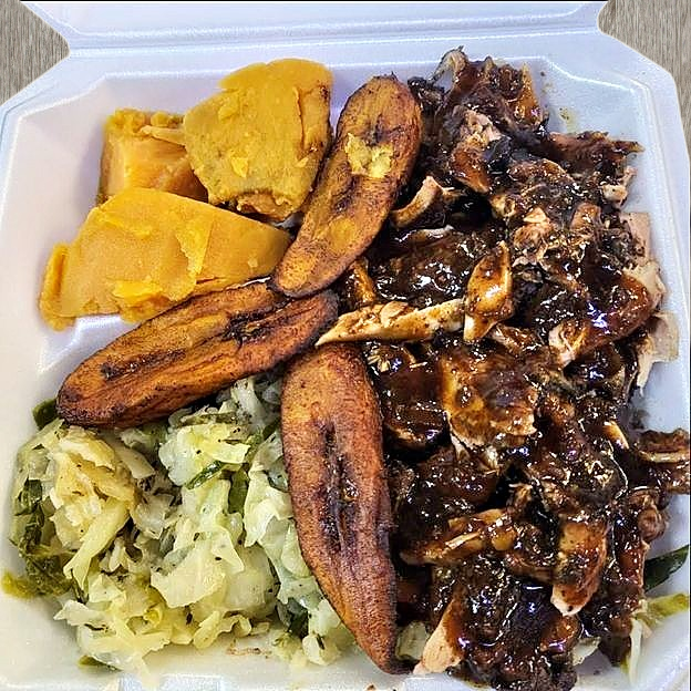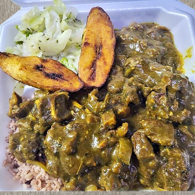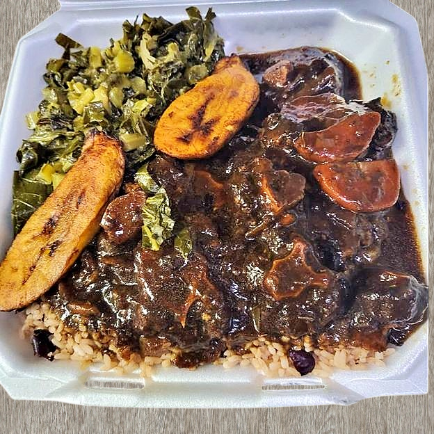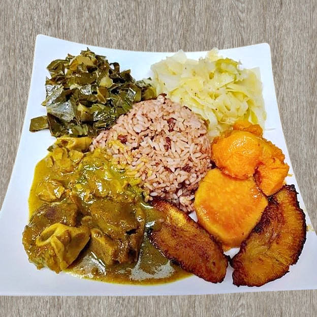 Combo of vegetables served over rice, plantain with homemade vegan sauce.