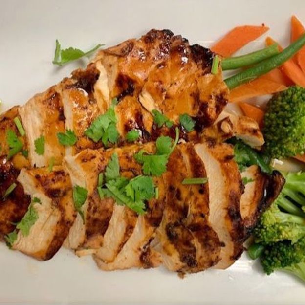 Grilled chicken skewers marinated in Thai spices, served with peanut sauce and cucumber salad.