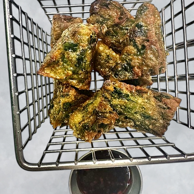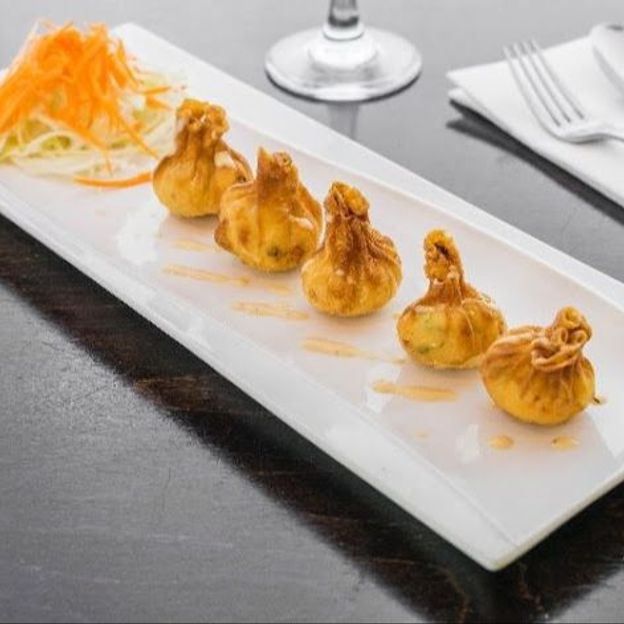 Crispy fried wonton pouches filled with crab meat, cream cheese, carrots, and scallions.