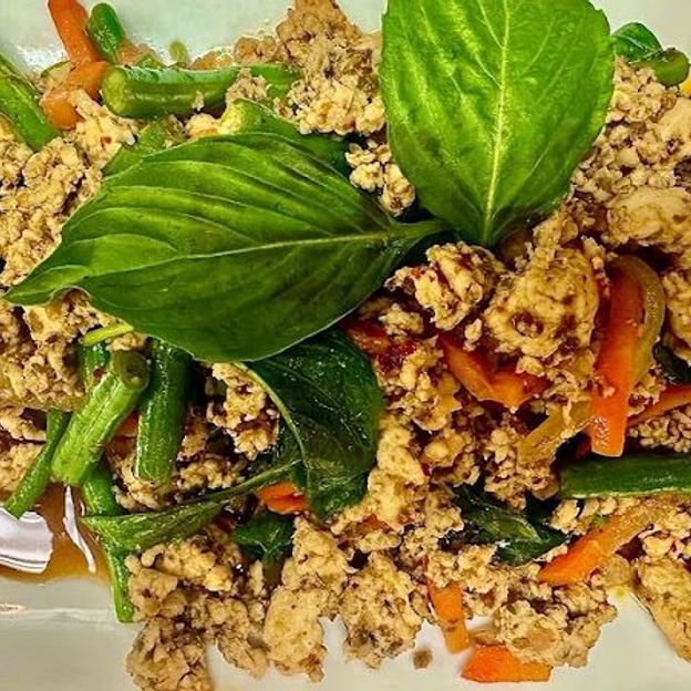 Traditional Thai green papaya salad tossed with peanuts, green beans, tomatoes, and spicy lime dressing.