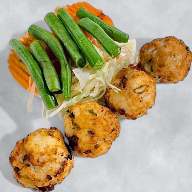 Spicy chicken balls marinated with fresh chili, garlic, onions, rice, and kaffir lime leaves, deep-fried to perfection.