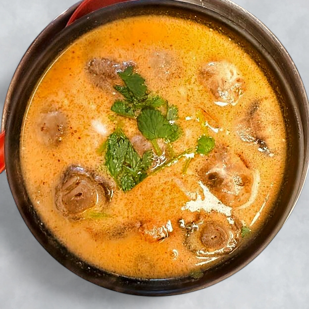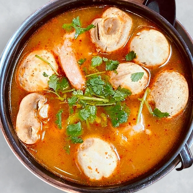 Traditional Thai hot and sour soup in aromatic lemongrass broth with fresh mushrooms, cilantro, scallions, galangal, kaffir lime leaves, and Thai spices.