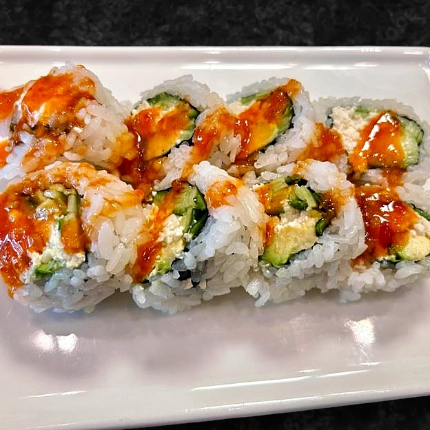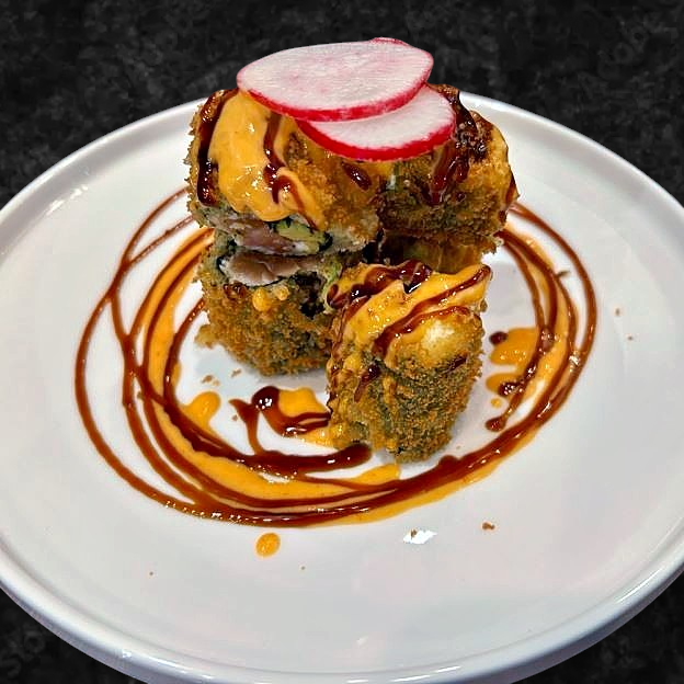 aresh salmon, avocado, cream cheese wrapped in nori & Tempura fried with sweet soy glaze & sweet chili aioli