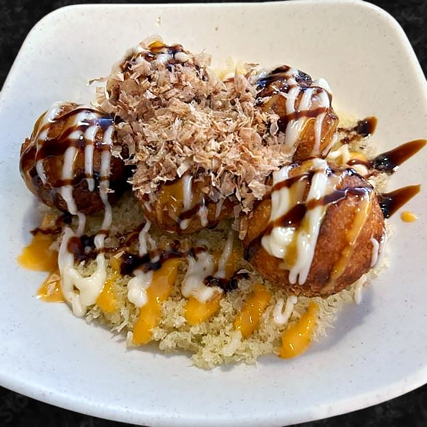 Deep frted octopus dumplings, bomto topping
