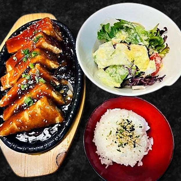 2pcs. Gyoza. 1pc. Shrimp tempura, Salad. Rice. 2 House Side Dishes. Miso soup + Your choice of 2 Items