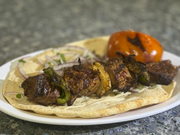 Two skewers Tenderloin beef with chopped onions and parsley seasoned with a blend of spices. Served with rice, hummus, salad, and pita bread.