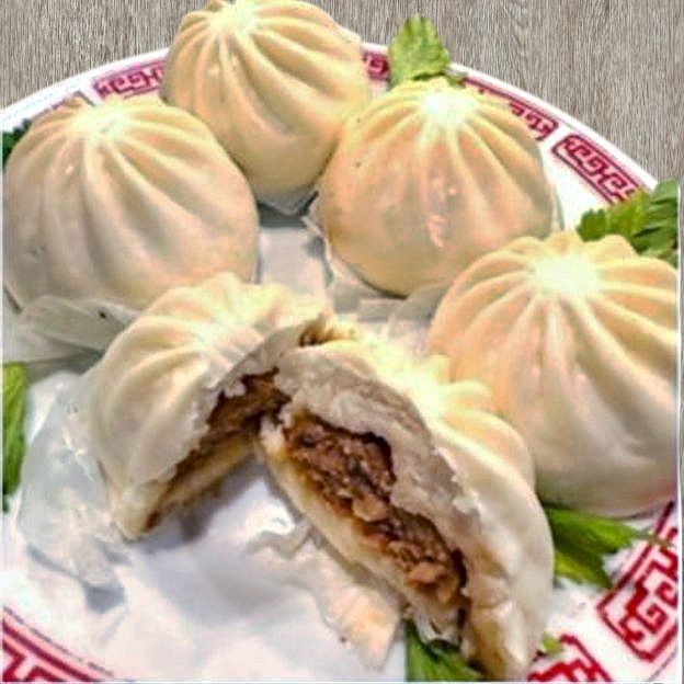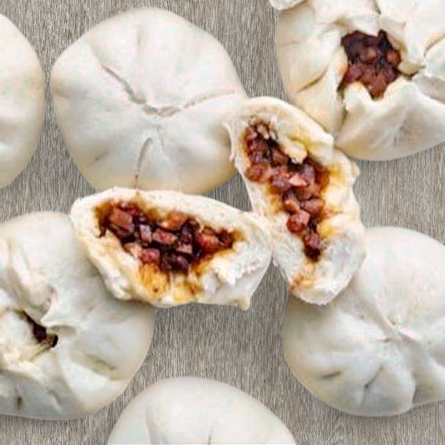 Stuffed proteins and veggies inside a fresh and flaky bun. Topped with purple onions, cucumber, carrots and green onions
