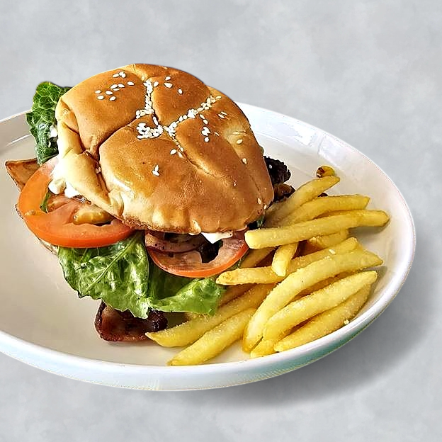 Choice of steak or chicken, ham, bacon, cheese, lettuce, tomato, onions, corn, fried egg, mayo, & ketchup all in a large bun. Can be customized to your preference.