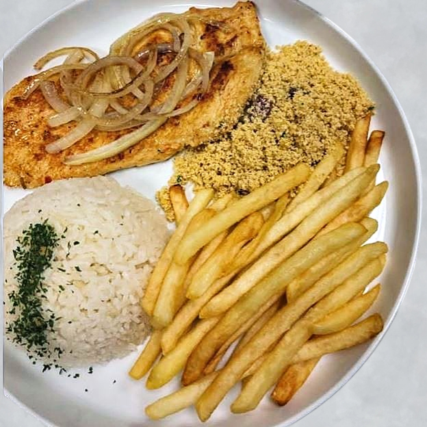 Tender beef steak topped with sweet, caramelized onions and served with rice, beans, vinaigrette and potato salad.