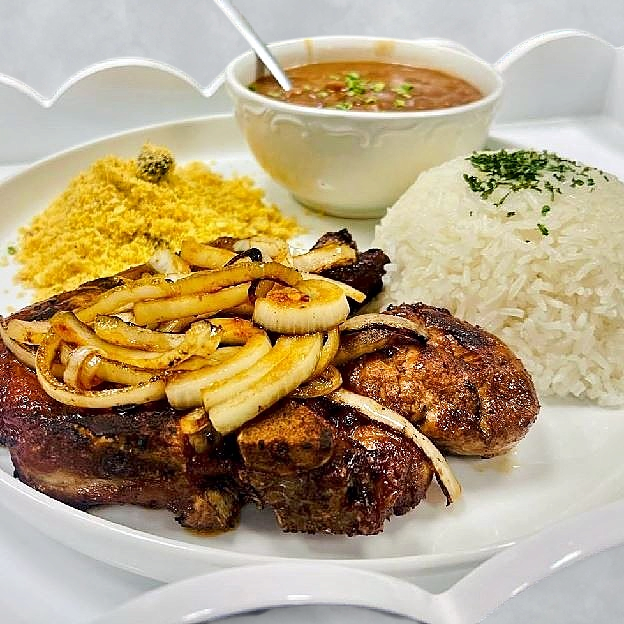 Juicy, char-grilled pork steak, served with rice, beans, vinaigrette and potato salad for a satisfying, flavorful bite.