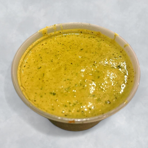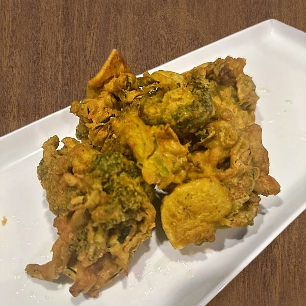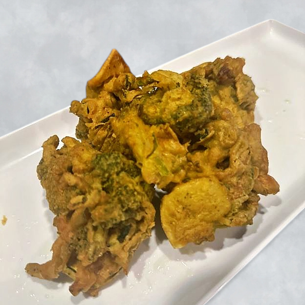 Deep-fried crispy potato patties in garbanzo bean & chutney