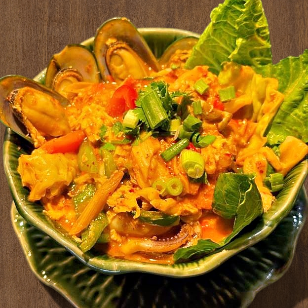 Mixed seafood in a flavorful broth of lemongrass, cilantro, basil, lime leaves, mushrooms, onion, and tomato.
