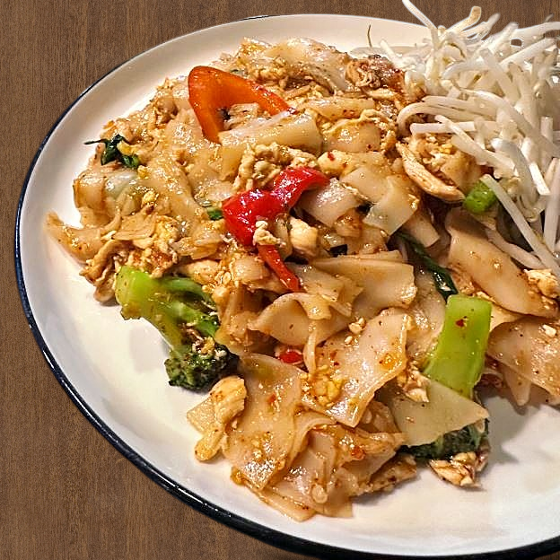 Wide rice noodles with egg, bell peppers, Thai basil, broccoli and beansprouts
