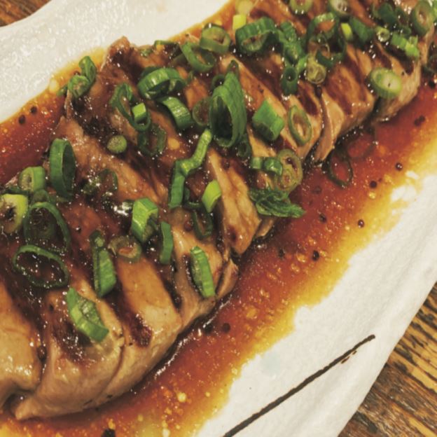 Tender juicy Pork Belly with Hoisin bbq sauce and sliced seedless cucumber and scallions