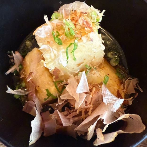 Fried tofu with clear traditional Japanese Dashi broth and bonito flakes