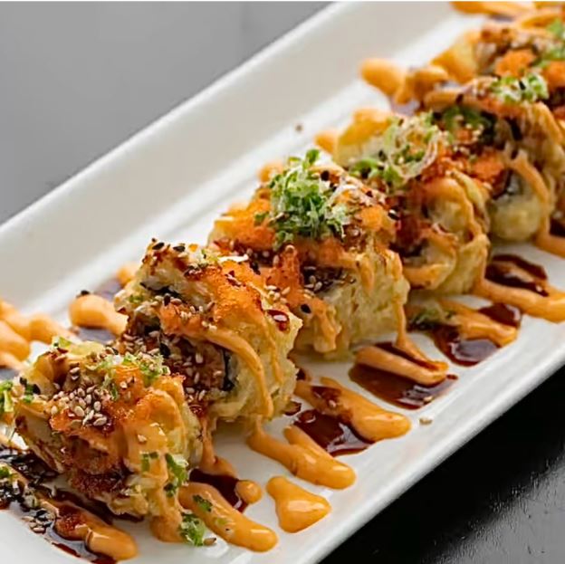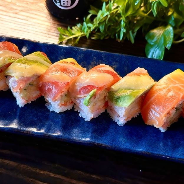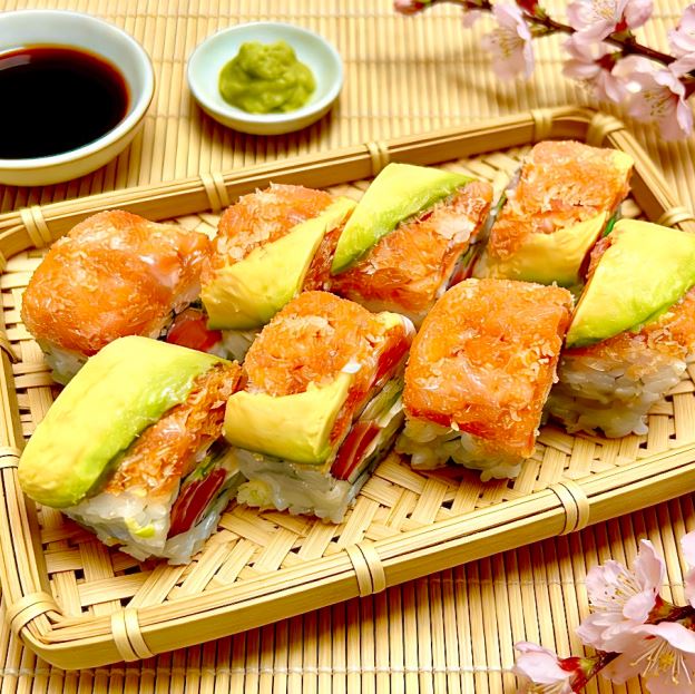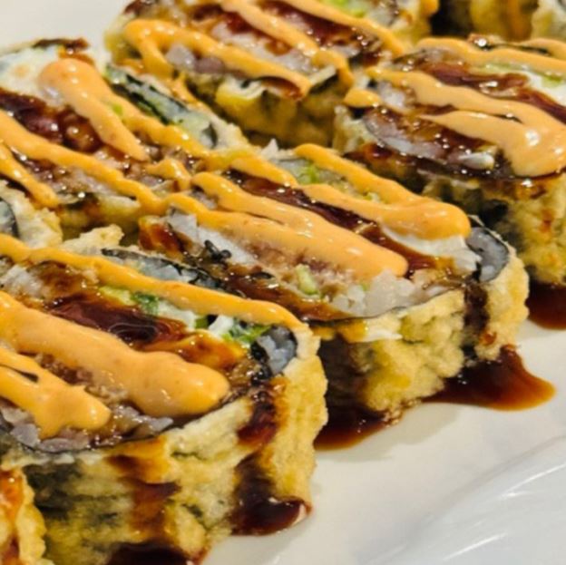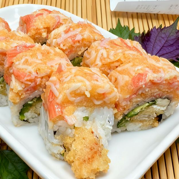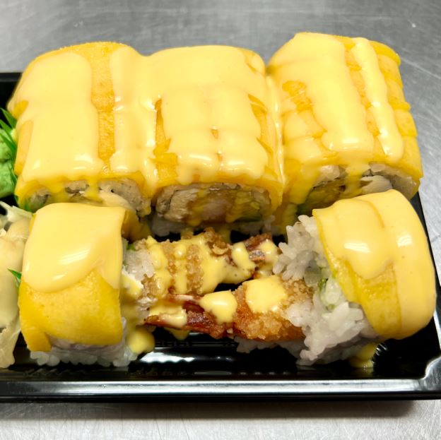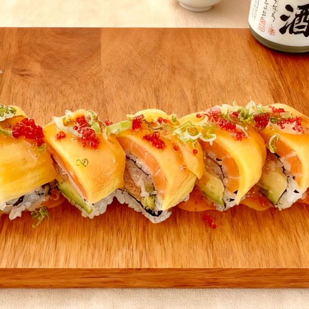 Spicy crunch kani, cucumber, mango wrap in sliced avocado top w. tobiko, spicy mayo & eel sauce