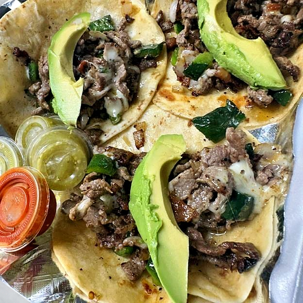 Asada steak, grilled onions & serrano peppers, refried beans, lettuce, cilantro, queso fresco.