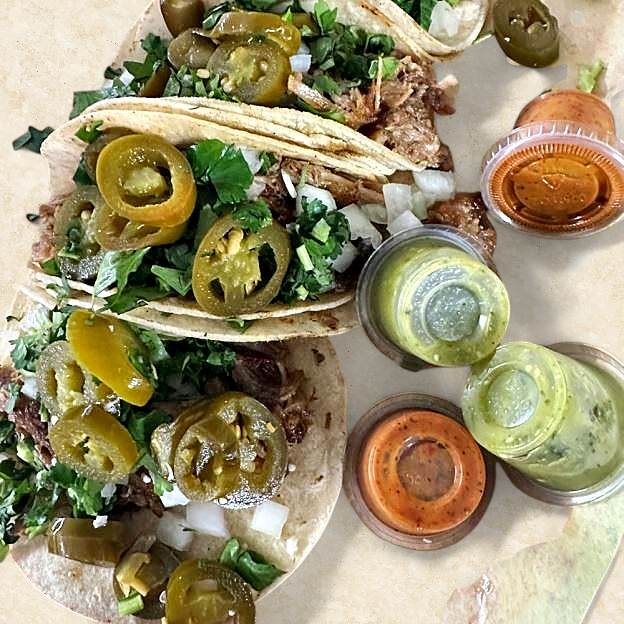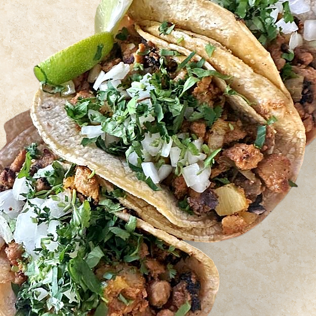 Onion, cilantro, lime, vinegar jalapeños, queso fresco.