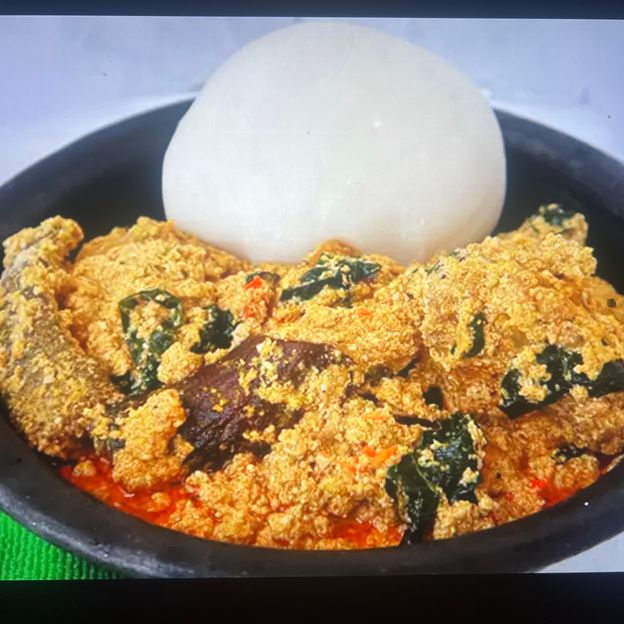 ground egusi seeds, palm oil, assorted meat or fish,, onions, Scotch bonnet peppers, locust beans (iru), and leafy greens like spinach or bitter leaves and spices