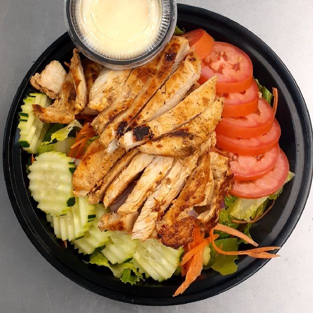 Marinated chicken breast, bed of lettuce, cucumber, tomato, onion, and carrot served with house dressing.