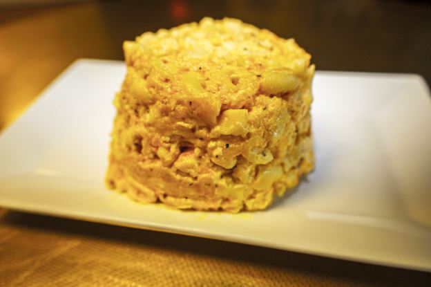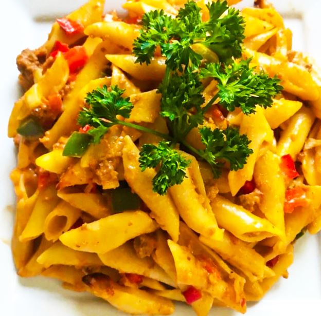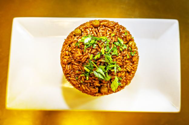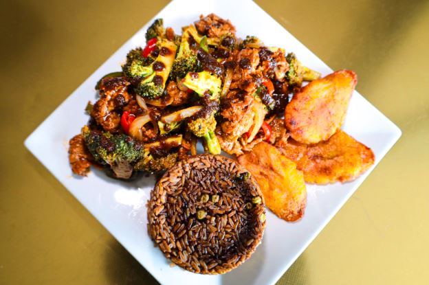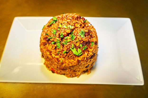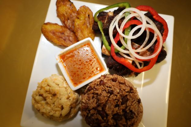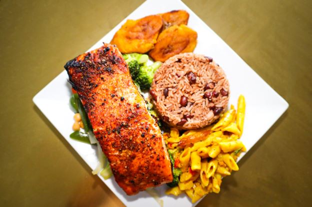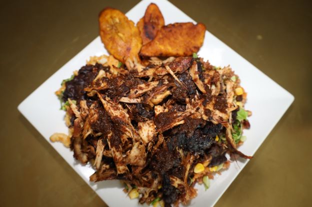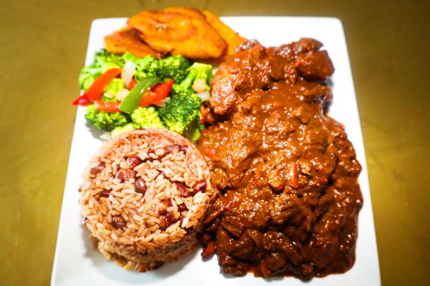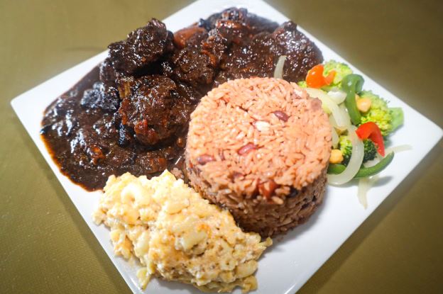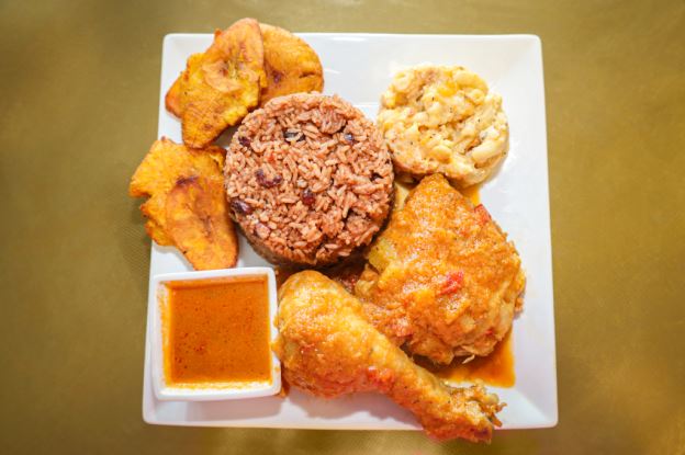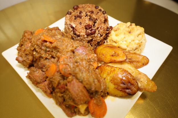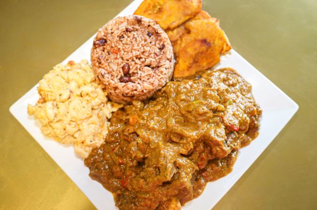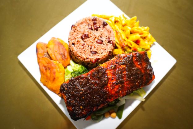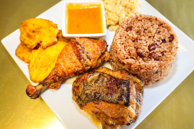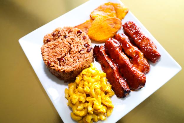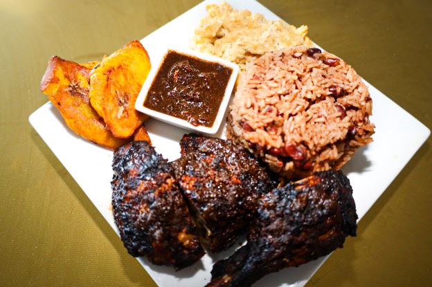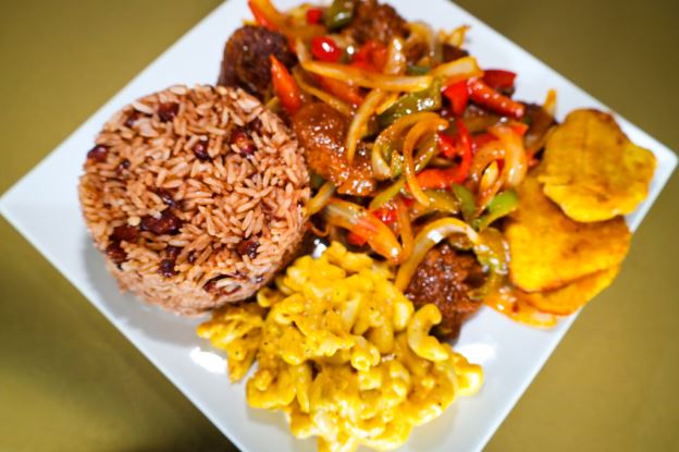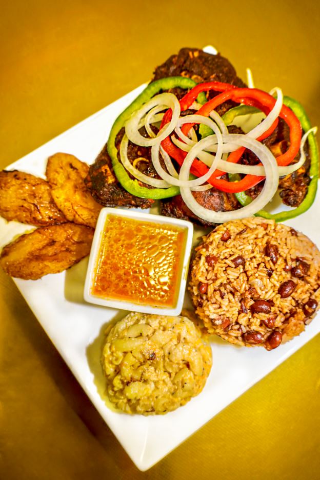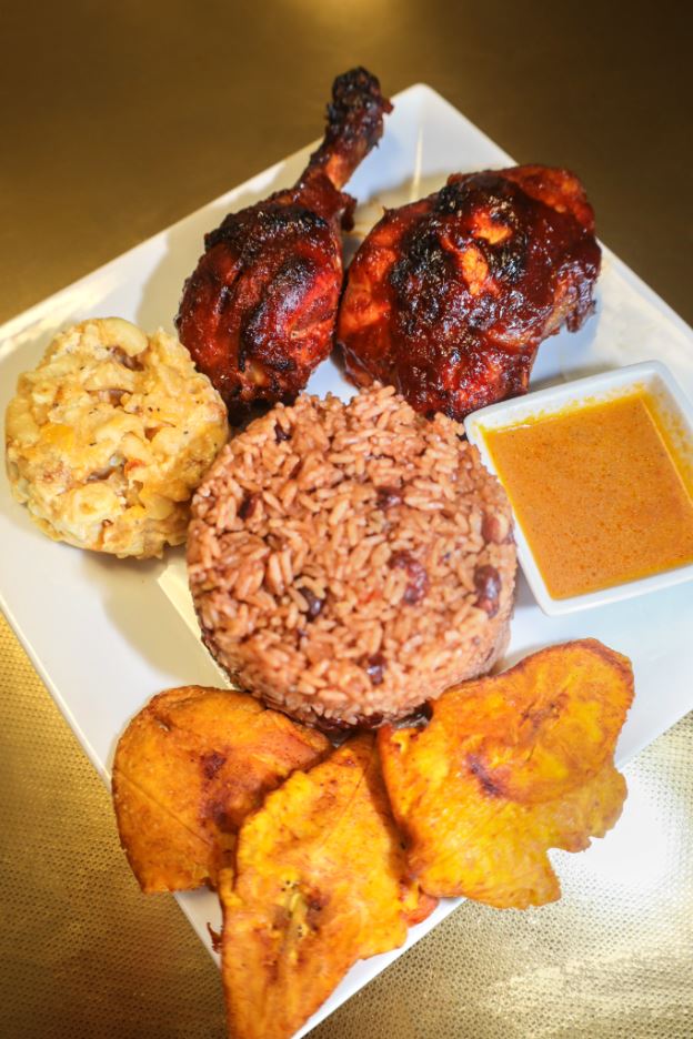served with rice, Green plantains, black bean stew, Mc & Cheese topped with chopped Jerk Chicken