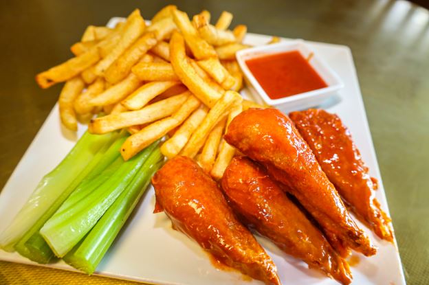 8)buffalo style jumbo chicken wings tossed in spicy pepper BBQ