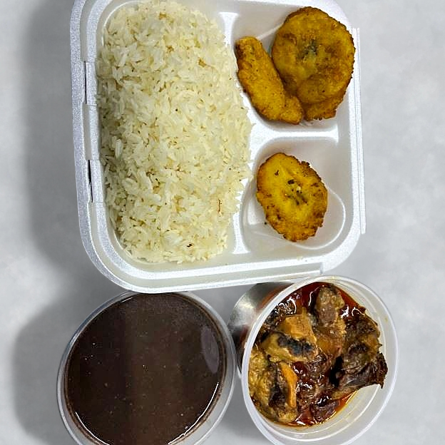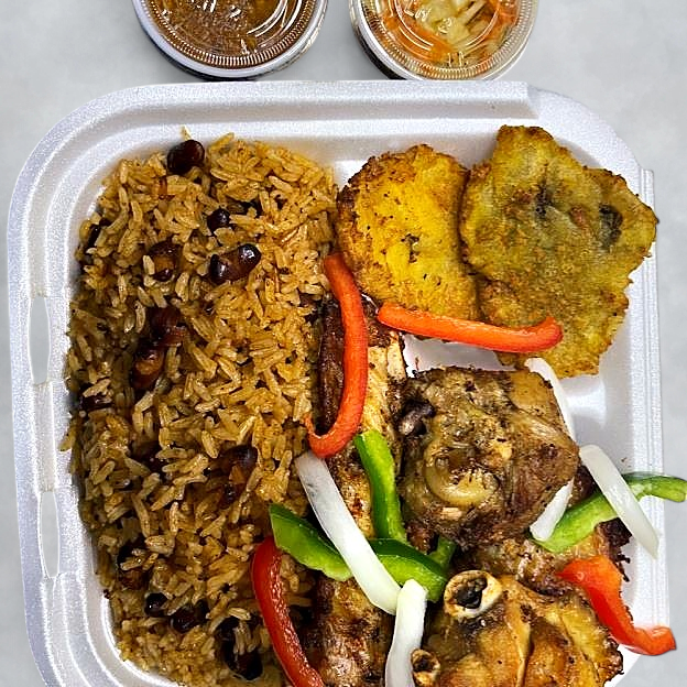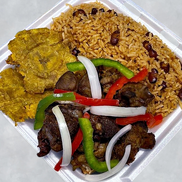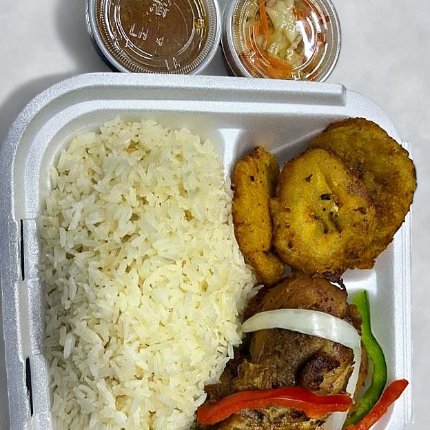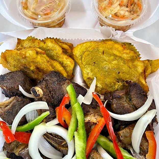 Fried goat typically served with plantains, pikliz (Haitian hot sauce with peppers, vinegar, and cabbage), and onions.