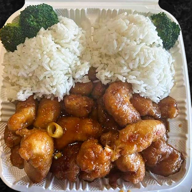 Orange chicken w.Chicken Fried rice & Beef Lo Mein . The tray size is 11.75in X9.37 in X2.31in.Each tray serves 4-6 people