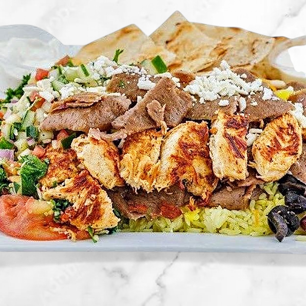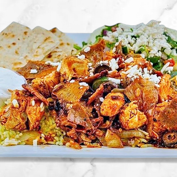 Sliced thin seasoned beef and lamb mix over top rice, served with pita bread, your choice of salad, topping, and dressing