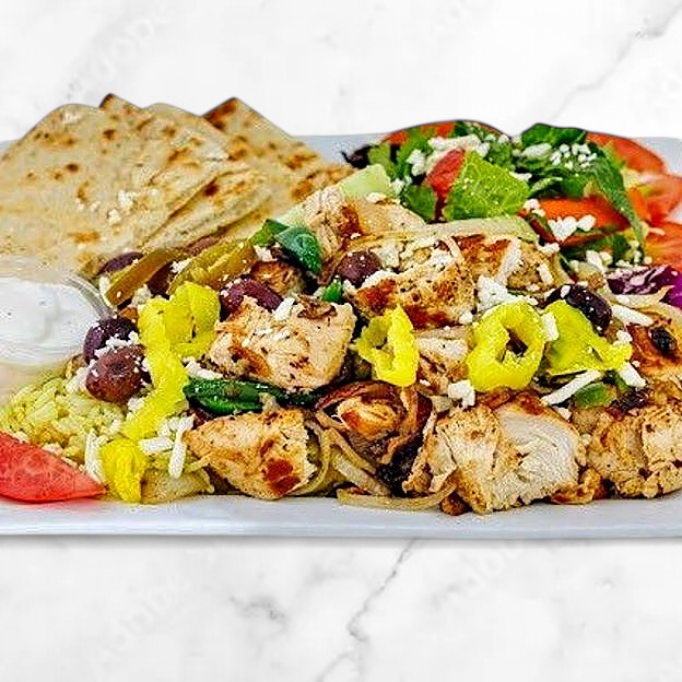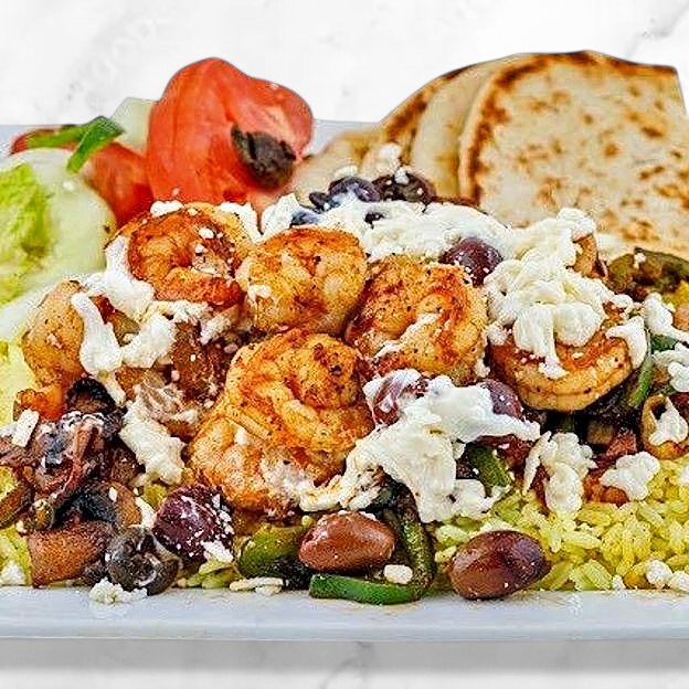 Gyro, chicken & shrimp over top rice with choice of salad, pita bread, feta cheese, black olives and homemade dressing.
