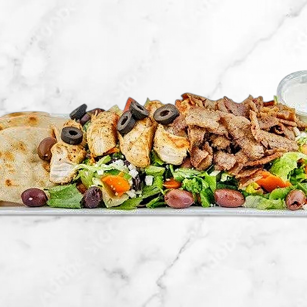 Gyro & chicken served with pita bread and your choice of salad, topping, dressing and pita bread
