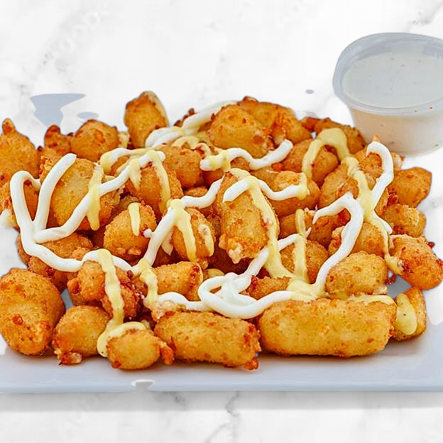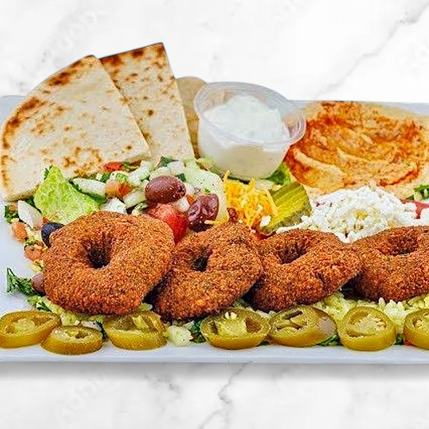 3 piece falafel over top rice, tabouli salad, hummus, pita bread, feta cheese, black olives and homemade sauce.