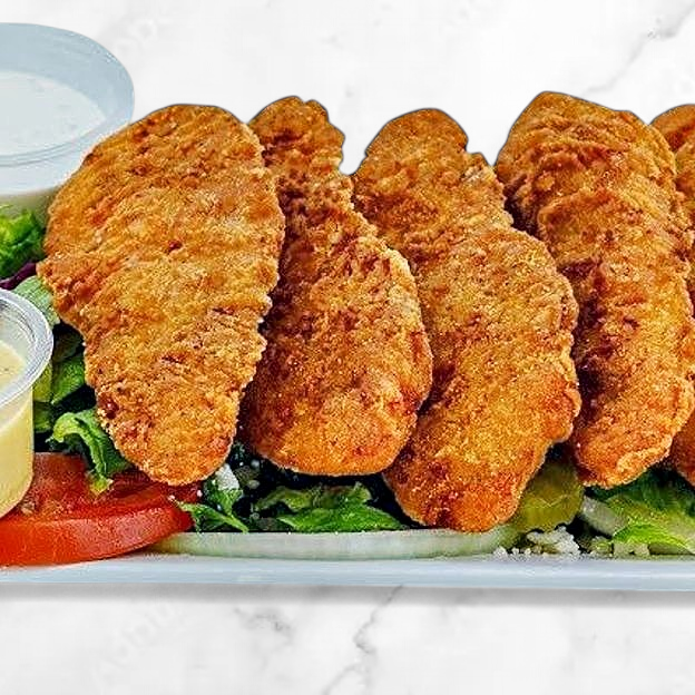 3 pcs fried crispy chicken comes on top of garden greek salad with pita bread