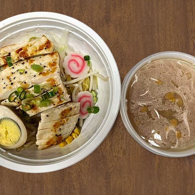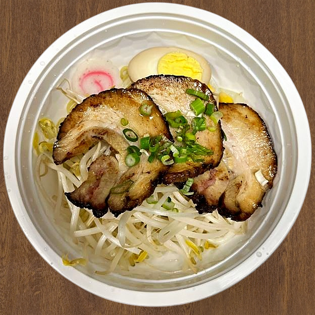 Chasu pork scallops bean sprouts, corn, poached Egg & fishcake