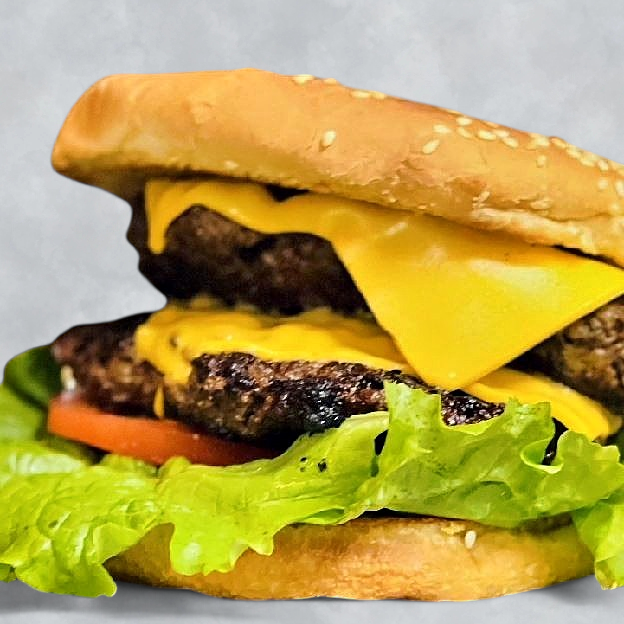 Double Patty Angus Chuck Beef, American Cheese, Mayo, Mustard, Lettuce, Tomatoes, Onions, Pickles.