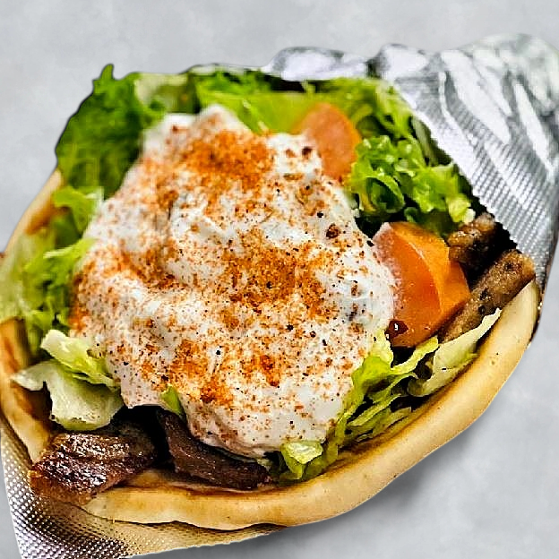 Shaved Gyro Meat from cone, Tzatziki Sauce, Onions, Tomatoes & Lettuce.
