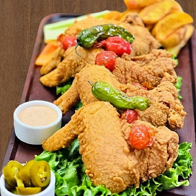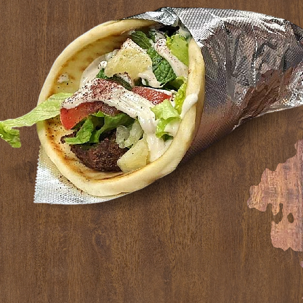 Deep fried falafel pieces, Cucumbers, Pickles, Tomatoes, Tahini Sauce.