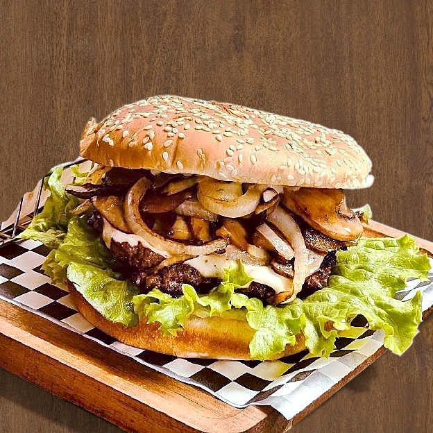 Single Patty Angus Chuck Beef, Swiss Cheese, Mayo, Grilled Onions, Grilled Mushrooms, Lettuce.