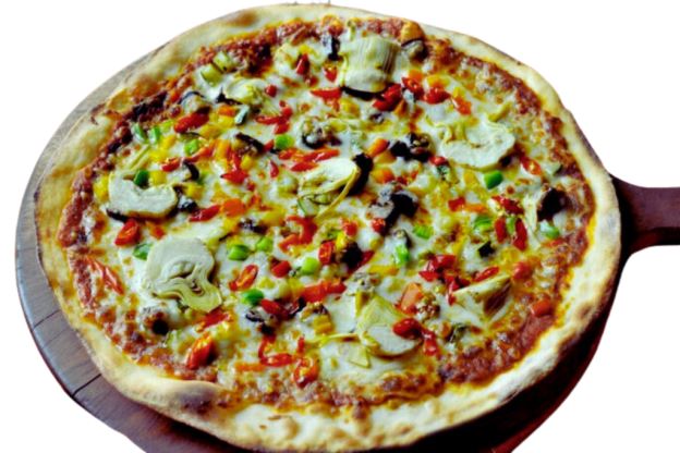 A vibrant medley of fresh vegetables layered on a crispy crust, topped with melty cheese, and adorned with broccoli and spinach. A delightful combination of flavors and textures in every bite.