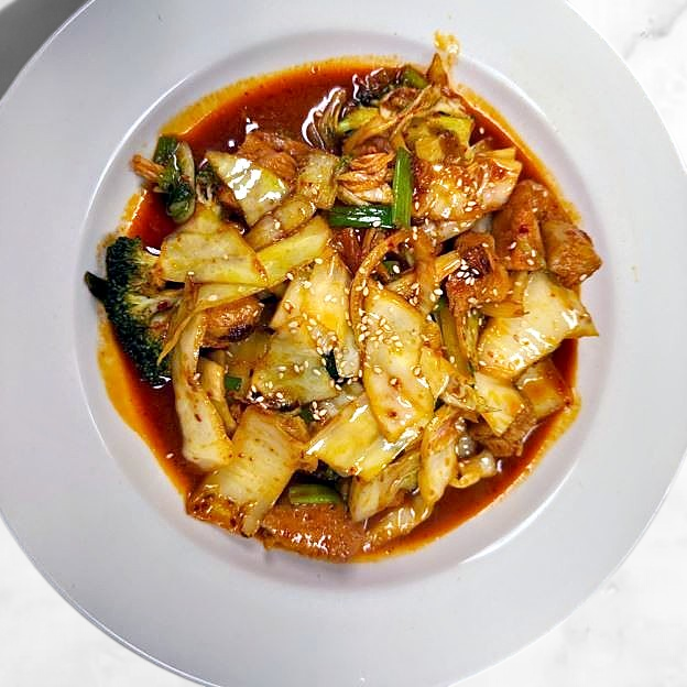 Stir fried kimchi with vegetable and pan-fried tofu