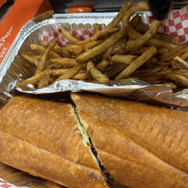 On an Amoroso Roll. 2 patties chopped up with Grilled onions , American Cheese, ketchup, Mayo, lettuce and tomatoes