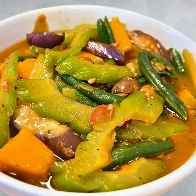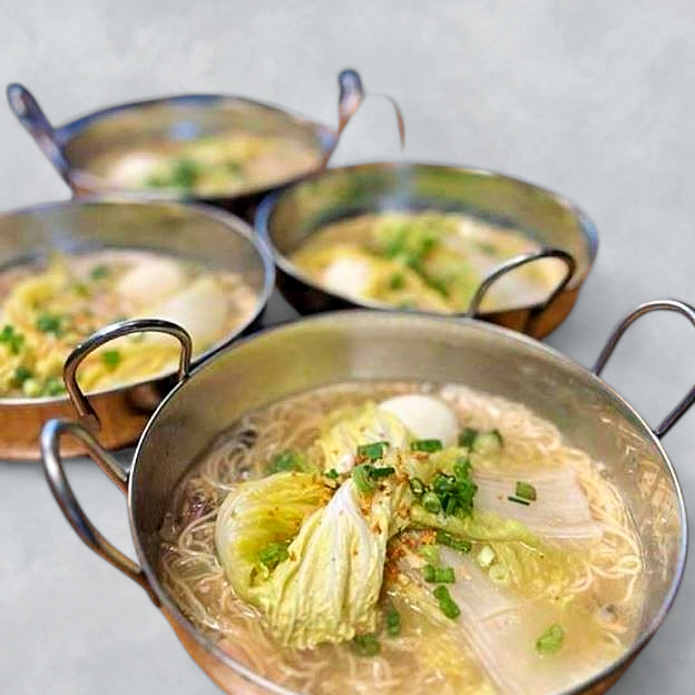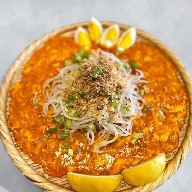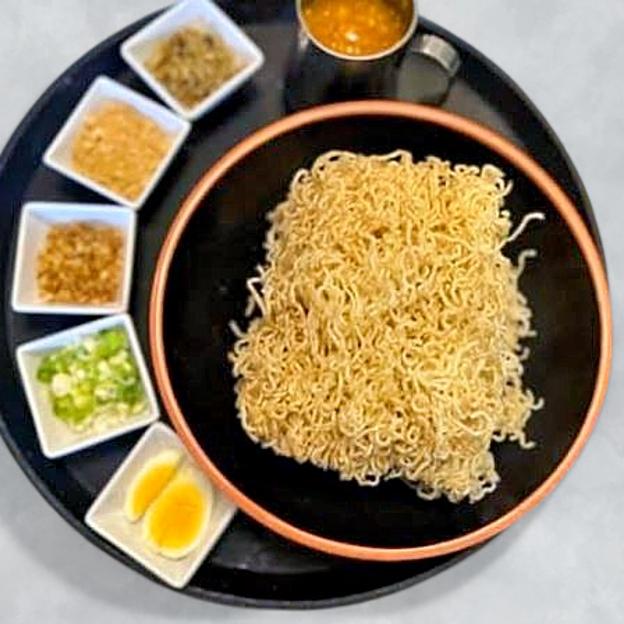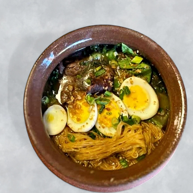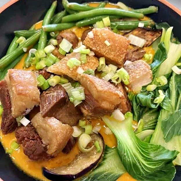 A rich Filipino noodle soup with thick egg noodles, loaded with fish balls, kikiam , lechon kawali, and crispy chicharon in a savory broth.