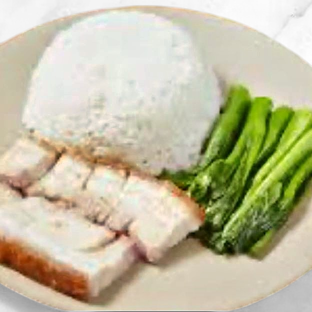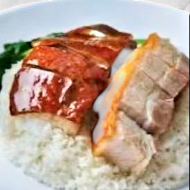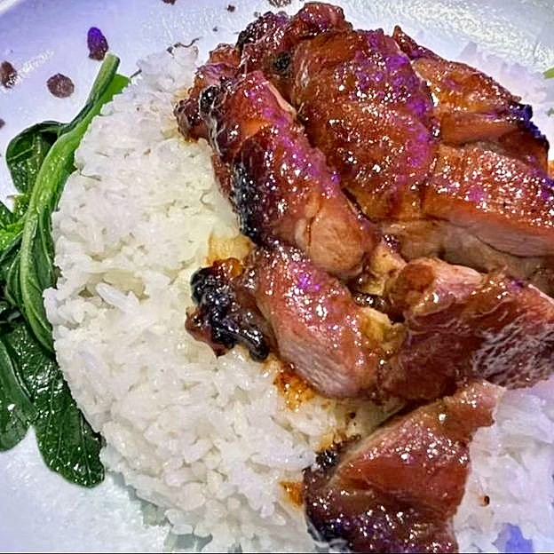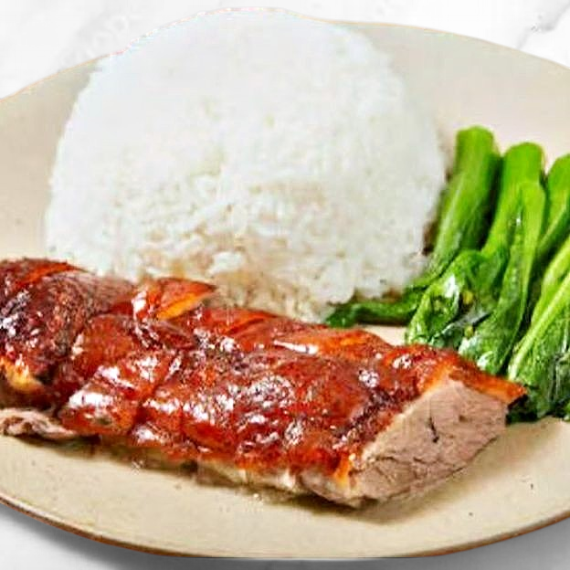 Succulent barbecued pork slices served atop a bed of steamed rice with a side of crisp bok choy.