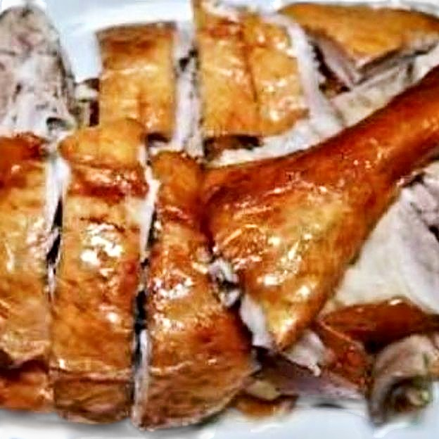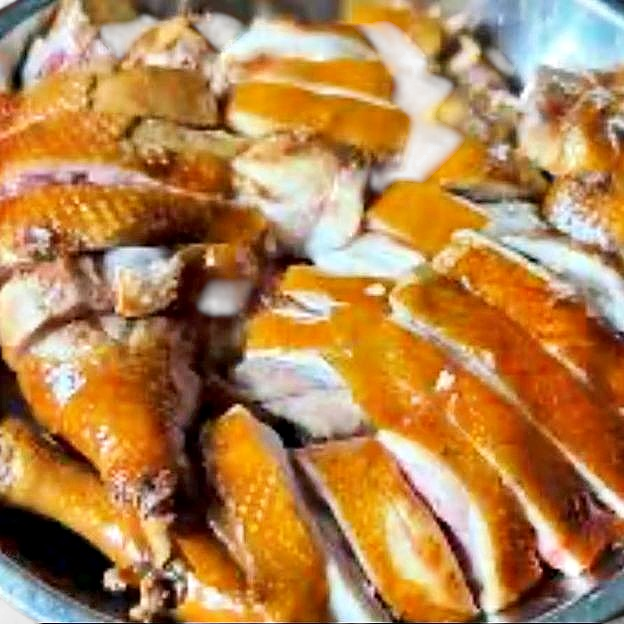 Marinated whole chicken glazed with soy sauce, featuring tender, juicy pieces with a rich, savory flavor.