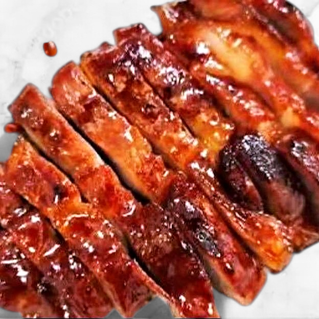 Tender pork, marinated and glazed in a honey BBQ sauce, typically includes a blend of sweet and savory spices. Serves approximately two pounds.